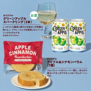 セットのお酒は「オリジナル グリーンアップルスパークリング(お酒)」。青りんごの品種「グラニースミス」は、オーストラリアで「スミスおばあちゃん」が発見した品種で、しっかりとした酸味と爽やかな味わいが特徴です。飲み切りサイズが嬉しい350ml缶を2缶ご用意します。