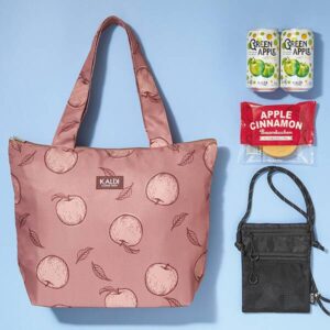 軽くて丈夫なポリエステル生地を使った「トートバッグ」に、セット限定のお酒と焼菓子が入った『オリジナル りんごバッグ』です。おでかけに便利な「ミニショルダーバッグ」も付いています。